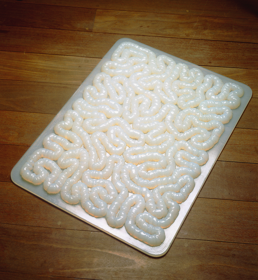 Attracted by the glistening surface of Rubber Mat, we see on closer inspection that the spongy silicone has been molded to resemble coiled intestines. Although a welcome mat typically serves as an invitation to enter a home, Hatoum’s bizarre version invites only to repel. The artist fuses the pliant silicone and vivid bodily image to activate and conflate our sense of touch and feelings of disgust.