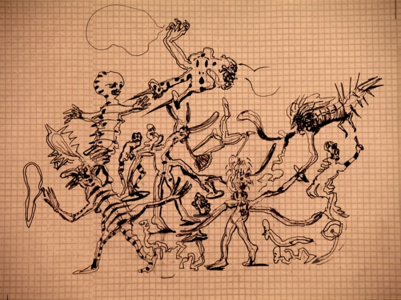The stop-motion animation Penelope is inspired by the female protagonist of Homer’s Odyssey who, to stall her suitors who press her to remarry, obsessively weaves and unweaves a shroud during her husband’s extended absence. The work depicts a monstrous figure who comes into being line by line and disappears in the same manner, visualizing Penelope’s continuous loop of stitching and unstitching by means of Malani’s consummate drawing technique.