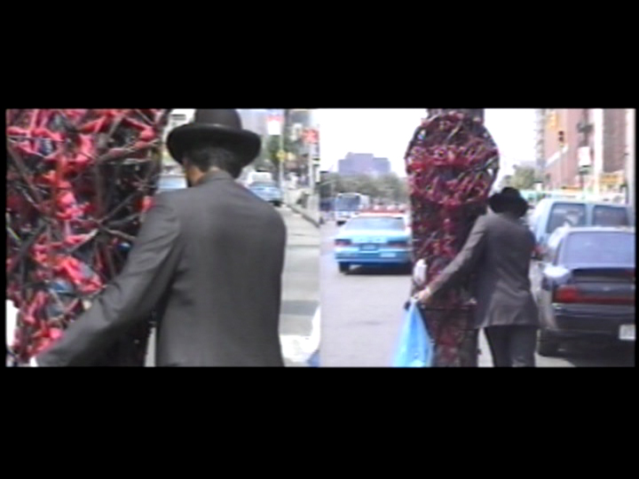 Nari Ward, Pushing Savior, 1996. Digital video (color, sound; 07:01 minutes). Dimensions variable. Institute of Contemporary Art/Boston. Gift of the artist. Courtesy the artist and Lehmann Maupin, New York and Hong Kong. Filmed by Marcel Odenbach. © Nari Ward