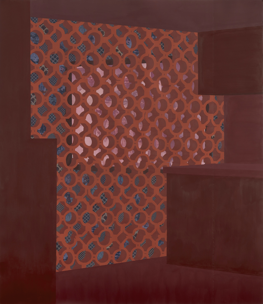 Facets: Screen Wall, included in Akunyili Crosby’s solo exhibition Portals in 2016 at Victoria Miro, London, is a meditation on the mutable and open boundary between the private and the public. The painting depicts an interior decorative breezeway with a concrete lattice screen, an architectural motif and material common in many homes in warm climates. The work further accents this seemingly minimal surface with countless glimpses of small details and personal figures. Each gap in the latticework screen, for example, shows a different design, motif, or an image of a friend or family member. For Akunyili Crosby, these portals, functioning as embedded miniature visual gestures within the painting’s field, transform the scene from a quiet domestic interior to windows onto private memories. Color demarcates these various spaces, with solid, dark raspberry walls sharply contrasting with the electric red of the screen, behind which gray-blue patterned motifs and a faded pink family portrait peek through. Akunyili Crosby describes her interest in thresholds, doorways, and windows in private interior sites—as well as her use of collaged found imagery—as a fascination with how layered artistic compositions can create “openings that pull you into other worlds.”