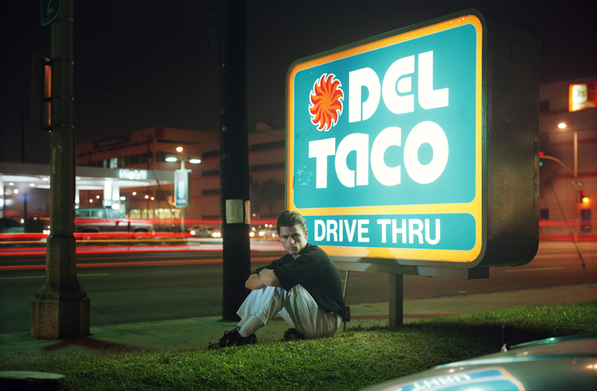 Ralph Smith; 21 years old; Ft. Lauderdale, Florida; $25 exemplifies diCorcia’s subtle yet incisive reflection on the currencies of fantasy and desire. With grant money from the National Endowment for the Arts, diCorcia made multiple trips to Los Angeles, where he scouted locations, staged scenarios, and located male prostitutes on Santa Monica Boulevard who agreed to pose for his camera for the same fee they would receive for their more typical service. As curator Bennett Simpson writes, the image shows “a movie-star handsome man seated on a patch of grass in front of a Del Taco drive-through sign. It is night, and the man appears to be waiting, possibly bored or deep in thought. In a sense he blends in perfectly with his surroundings: an advertisement for some fantasy, a product for sale, another fragment in L.A.’s landscape of come-ons. Even as car lights smear by in darkness, the man’s face—like the fast-food sign—remains perfectly still, a figure of desire raised out of its moment to stand for a more universal instability.”