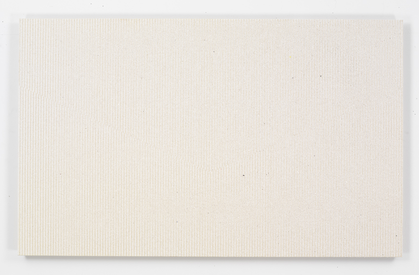 Exhibition Guide, Chapter 15 [white diamond dust arrow pattern] is a signature work by Quaytman. It has a strong physical presence, intensified by the diamond dust that covers its surface to create a seductive, sparkling galaxy, while frustrating attempts by the eye or mind to formulate a single vision or interpretation of the work as a whole. This is characteristic of Quaytman’s paintings, whether featuring optical illusions, fluorescent color, or light sources captured by photography—light sources that often, paradoxically, create blind spots. The subject matter, in this case the image of an arrow, is closely tied to her interest in the viewer’s relation to the work as well as to the context in which the work is encountered. Quaytman frequently uses the arrow for its strong visual draw, both attracting the viewer’s attention and directing it beyond the painting. Exhibition Guide, Chapter 15 [white diamond dust arrow pattern] also has a special significance in relation to the ICA/Boston, as the arrow in this painting references an archival image Quaytman came across at the museum: the photograph documents a 1965 ICA exhibition that included an op art painting of an arrow, attributed in the archive to an artist identified as “T. Priest.”
