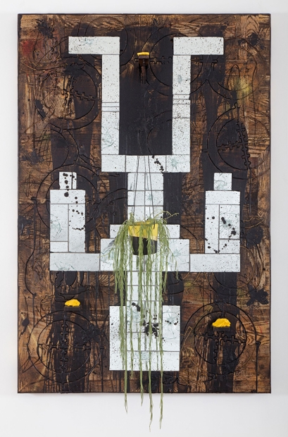 Rashid Johnson, Falling Man, 2017. Burned red oak flooring, spray enamel, mirror, black soap, wax, ceramic, plant, and shea butter. 73 × 48 1/4 × 2 inches (185.4 × 122.6 × 5.1 cm). Institute of Contemporary Art/Boston. Acquired through the generosity of Phillip Ham and Christie Zhou. Courtesy the artist. © Rashid Johnson