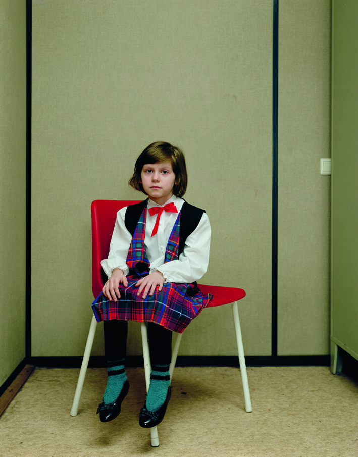 The subject here, Almerisa, was six when Dijkstra first photographed her in 1994 at a refugee asylum in Leiden, Netherlands. The ongoing portfolio that emerged records Almerisa’s transformation from a young girl from the former Yugoslavia to a woman, now a mother, from Western Europe. Dijkstra’s compositions maintain a spare and consistent format (frontal symmetrrical, seated pose, blank background), accentuating the changes, both physiological and cultural, in Almerisa’s appearance over time. A time-lapse portrait of identity in formation, the photographs also record a broader social context of war-wrought displacement and hybrid belonging. Using a 4 x 5 view camera and an unusually long exposure time, the artist’s technique allows for a quality of detail not often seen in the digital age. Almerisa locks her eyes with the camera lens, as though studying the portraitist and by extension the viewer, summoning a reciprocal gaze.
