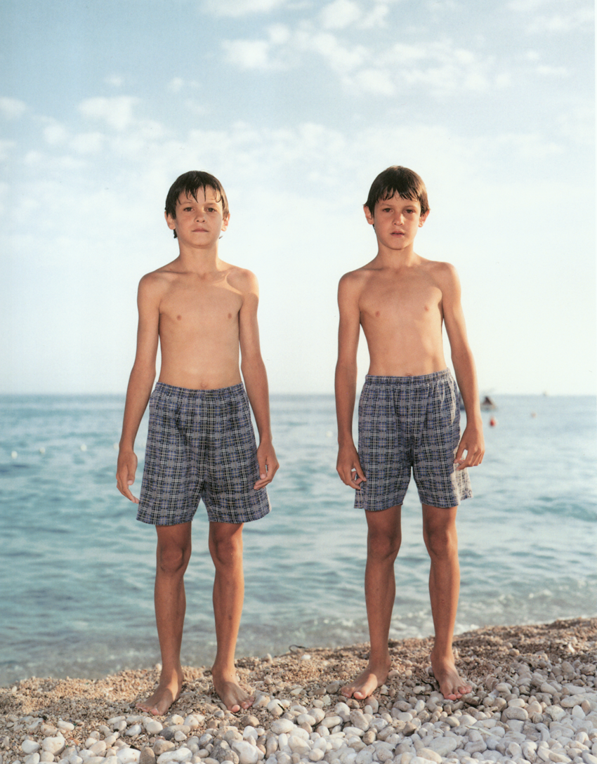 Dubrovnik, Croatia, July 13, 1996 is part of a series of twenty portraits that document the innocence and awkwardness of adolescence. Taken across Europe and the East Coast of the United States, the images are titled with location and date without reference to the subject’s name. Dubrovnik, Croatia, July 13, 1996 depicts two young boys, presumably brothers, wearing seemingly indistinguishable bathing suits. Beyond slight differences in the way the boys hold their arms, their stances are nearly identical. This image draws upon the rich tradition of images of bathers in art history.
