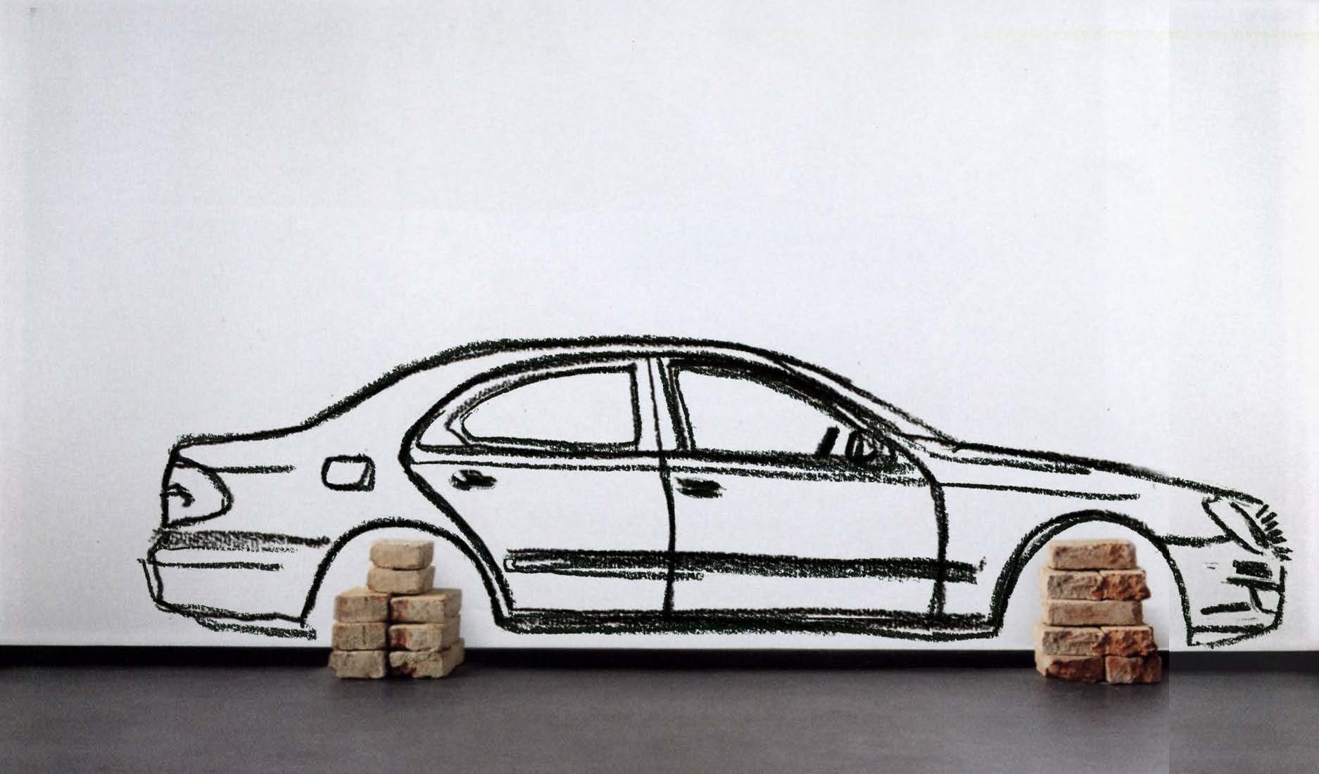 Rhode explores ideas of play and popular culture in urban environments. Car on Bricks recalls one of the recurring forms in Rhode’s murals—everyday vehicles—through an instruction-based artwork that comprises a drawing of a car on a gallery wall with locally-sourced bricks standing in for the wheels, a tongue-in-cheek reference, perhaps, to structural immobility and arrested movement. Like other works in his signature style, Car on Bricks achieves its animating quality through the style of the drawing itself (the artist instructs broad strokes to mimic tire marks on asphalt, or a speeding car across a landscape), as well as an engagement with the wall. With its sense of narrative potential, this work invites viewers to engage imaginatively with the scene and the museum space.