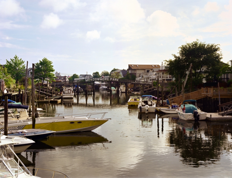 County Line Meadowmere Park, one of sixteen photographs included in Ethridge’s solo exhibition at the ICA/Boston in 2005, is from the series County Line, which records views of a quiet ocean-side community located on the Nassau County line in Queens, New York. As this photograph demonstrates, though the artist uses a particular location as a touchstone for this series, he balances specificity with generalization. This handsome view of boats, water, and foliage topped by a generous swath of blue sky and puffy clouds is reminiscent of a classic Dutch landscape, but it is edged with signs of contemporary life, such as the boats’ instrumentation and engines. Duality is further marked by the sky’s subtle shift in tone near the center of the image—Ethridge’s wry reference to the county line marked by the waterway shown. In these seductive images, dividing lines that are present but not fully visible keep the viewer at a certain distance.
