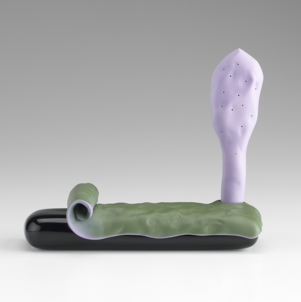 As in his best works, Nagle’s Faberge Leg conflates references and forms from disparate sources to humorous effect. About the size of a sardine can, the sculpture evokes this classic compact container, with a green ceramic layer peeling back to reveal a smooth black porcelain slab, bathed in a glassy, reflective surface. Read from the left to the right, the work also resembles a small bed, but as it progresses horizontally, references shift to landscape as a lavender form sprouts to suggest a cactus or tree, as well as a bodily protrusion. The corporeal allusion is reinforced by the title’s word play, Faberge Leg, conjuring the bejeweled baubles of the tsars to describe the awkward epoxy leg sprouting from this exquisite landscape.