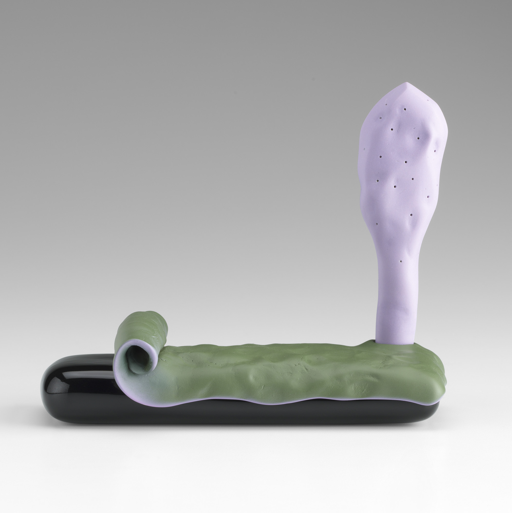As in his best works, Nagle’s Faberge Leg conflates references and forms from disparate sources to humorous effect. About the size of a sardine can, the sculpture evokes this classic compact container, with a green ceramic layer peeling back to reveal a smooth black porcelain slab, bathed in a glassy, reflective surface. Read from the left to the right, the work also resembles a small bed, but as it progresses horizontally, references shift to landscape as a lavender form sprouts to suggest a cactus or tree, as well as a bodily protrusion. The corporeal allusion is reinforced by the title’s word play, Faberge Leg, conjuring the bejeweled baubles of the tsars to describe the awkward epoxy leg sprouting from this exquisite landscape.