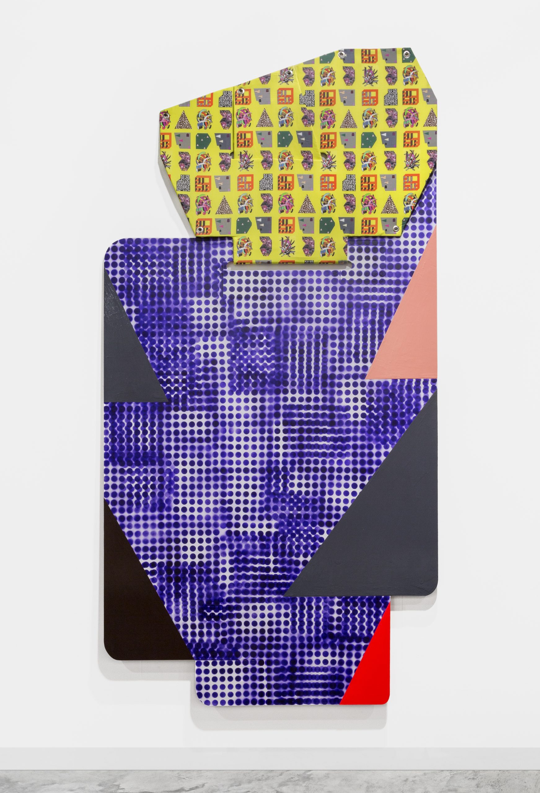 Untitled is from a body of shaped, two-part works made with a painted Plexiglas panel attached to, and suspended from, a digitally-printed fabric support. Root designs each of the fabrics in Photoshop—which she employs as an “image-making device,” as she has said—from a range of found imagery. In Untitled, a repeating pattern of geometric and biomorphic forms made from found images of 20th-century design is printed on a garish yellow textile. The fabric element is affixed to the wall with grommets, folded, looped, and stitched through an opening in a Plexiglas panel adorned with an off-register array of spray-painted polka dots. Swatches of dots are overpainted with solid triangular blocks of enamel that emphasize the curvatures of the oddly shaped panel. Untitled playfully upends the traditional relationship between canvas and stretcher by making the fabric function as a literal support, beyond being solely a material support for paint. The result is a hybrid object with an unresolved sense of tension and a productive interplay between hard and soft materials, digital and analog processes, and the fine and applied arts.