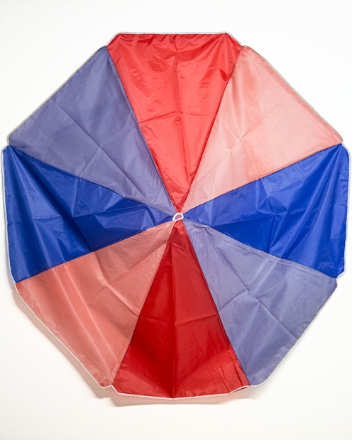 Untitled (Topanga, CA, Umbrella 17) displays the fabric of an umbrella removed from its support and pinned to the wall. The colorful pie-shaped sections form a simple hexagon, bringing to mind minimalist painting, the sculptural readymade, and a pop sensibility. To make this work, Falls first cut off umbrella panels and exposed one group of them to the sun for a prolonged period. He then interspersed these with the remainder of the panels, which had been protected from the sun. Brilliant red and deep blue panels thus sit next to their pale and faded counterparts, generating a subtle modulation of color. Like much of Falls’s hybrid production, Untitled (Topanga, CA, Umbrella 17) possesses a marked casualness and accessibility while touching on rich and deep topics such as the art object’s relationship to time and change, viewer perception, and artistic intentionality.