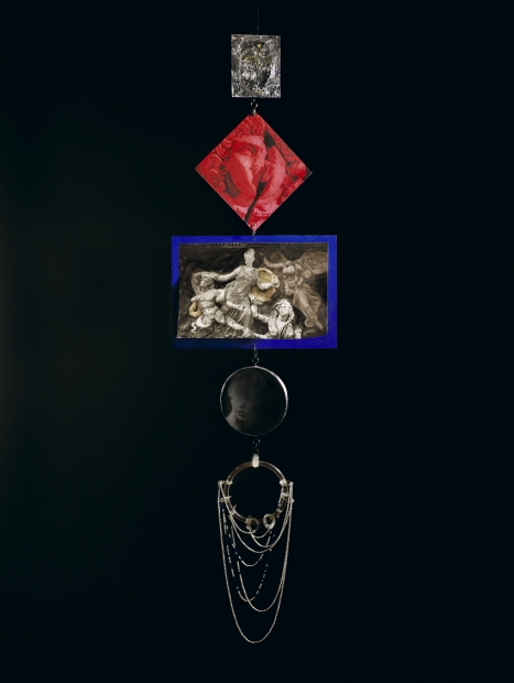 Medusa is a photograph of an assemblage VanDerBeek created in her studio. The temporary sculpture is a totem of images of historical sculptures, ranging from classical statuary and friezes to a work by the turn-of-the-century Italian artist Medardo Rosso. At the bottom of the objects is a piece of contemporary jewelry. One key element is a red-tinted photograph of Medusa, a figure from Greek mythology who turns humans into stone with her gaze, a process that can be analogized with photography, especially photography of classical sculpture. The work registers VanDerBeek’s engagement with art-historical references and contemporary modes of image making.