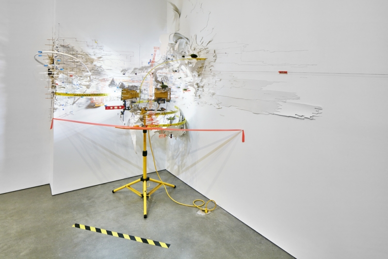 Sze was commissioned to create Hidden Relief by the Asia Society in New York. The work, sited in the corner of the gallery behind a strip of caution tape, appears to be at once a freestanding sculpture and part of the wall. Layers of paint peel away from the wall, and orange scaffolding and curving yellow rulers pierce the geological white forms. Sze uses a simple palette of white, orange, yellow, blue, and black throughout the work, which is brightly illuminated by floodlights that are part of the sculpture. On the walls, Sze has drawn diagram-like lines, using pins and string as if plotting the next move. Hidden Relief conveys a mesmerizing impression of movement, in which balance is constantly negotiated, questioned, and affirmed. The work reflects Sze’s acute attention to detail as well as her ingenious use and transformation of existing architecture.