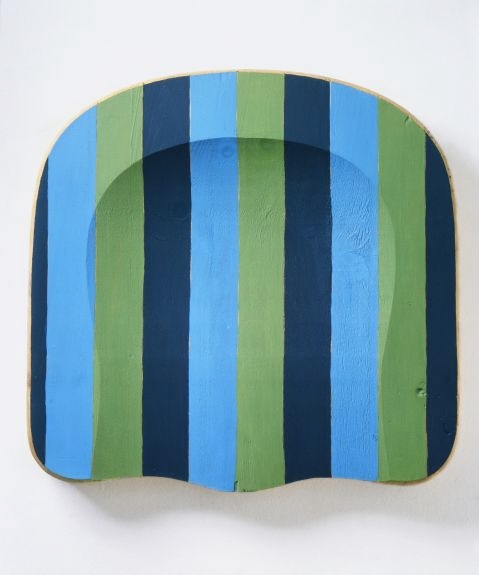 In 1983, Levine began to re-create printed reproductions of works by male modernists, raising questions of originality, authenticity, authorship, and the purity of medium. Chair Seat: 7 binds together the flatness of modernist painting, such as Frank Stella’s “stripe paintings,” with a readymade material—here a store-bought chair seat—creating an awkward combination of high and low culture, the abstract and the everyday. While modernist painting aspired to visual flatness and disdained decoration, Levine undermines both principles by overlaying abstract painting on a three-dimensional surface intended for bodily use.