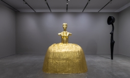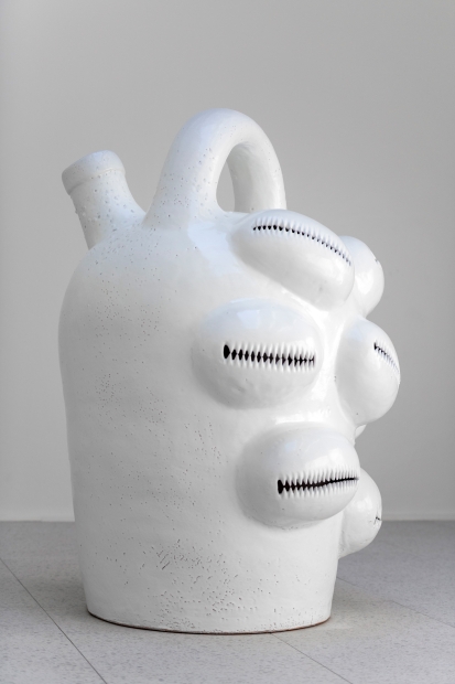 Over the past two decades, Simone Leigh (Born 1967 in Chicago) has created an expansive body of work in sculpture, video, and performance that centers Black femme interiority. Inflected by Black feminist theory, Leigh’s practice intervenes imaginatively to fill gaps in the historical record by proposing new hybridities. In 2022, the ICA commissioned Leigh to represent the United States at the 59th Venice Biennale from April 23 to November 27, 2022. Entitled Sovereignty, the exhibition featured a new body of work that collectively extends the artist’s ongoing inquiry into the theme of self-determination. Many of the featured sculptures interrogated the extraction of images and objects from across the African diaspora, exploring the potential for hybrid relationships and associations in the meeting between disparate geographies, traditions, and aesthetics within the work. Of the works presented in Sovereignty, the large-scale ceramic sculpture Jug references numerous investigations Leigh has made throughout her artistic practice. The work draws primarily on the face vessel, a type of object made in the American South by both enslaved and freed African American artisans in Edgefield District, South Carolina, a region renowned for the production of stoneware. These enigmatic face vessels might have functioned in ritual or religious practices, or as coded objects that disguised hidden meanings. For this interpretation, Leigh rescaled the traditional face vessel in the five-foot-tall Jug, the surface to which she has appended forms resembling cowrie shells. One of the world’s oldest forms of currency, cowrie shells are a significant recurring motif in Leigh’s practice, from her earliest table-top ceramics to her monumental suspended sculptures and scaled raffia works. In modeling the face of her large-scale jug with the cowrie visage, Leigh fuses numerous aesthetic languages and homages to ceramic traditions in a relationship that crosses time and history.