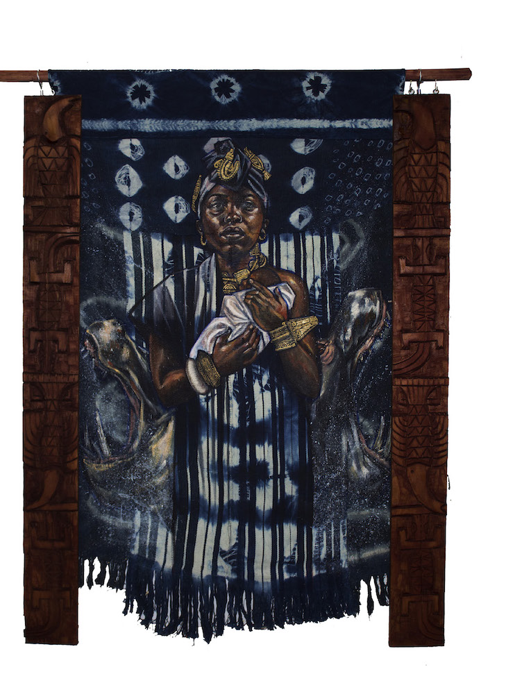Growing out of the artist’s research and interest in developing a program on West African cultural continuities in the African diaspora, The Founders Project is a series of nine multimedia paintings that reimagine Boston public high school students as the storied founders of West and West-Central African ethnic groups. Each life-size work combines painting with weaving and sculptural traditions specific to the ethnic group whose story is depicted. In Jahnae Wyatt as Queen Poku, Jahnae Wyatt, one of Hamilton’s former students is portrayed as Poku, legendary queen of the Baule people of modern day Ivory Coast. According to legend, when her people were fleeing the violent expansionist wars of the Ashanti people, they came upon a river too deep and wide to cross. Queen Poku offered her infant son to the river spirit in exchange for her people’s safe passage. After this sacrifice, hippopotamuses emerged from the river’s depths and her people were able to walk across the animals’ backs to safety. Wyatt is portrayed as Queen Poku at the decisive moment just before her sacrifice, flanked on either side by hippos emerging from the river. Painted on hand-dyed cloth and framed on either side by hand-carved wooden sculptures (all recalling elements of Baule culture), Queen Poku’s dress is a hand-woven passage of fabric. Hamilton weaves together past and present, creating a bridge between the ancient and modern worlds.