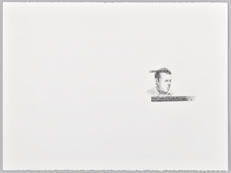Steve Locke’s (Born 1963 in Cleveland) practice spans painting, drawing, photography, and installation and explores ambivalent relationships between masculinity, homosexuality, and public memory. His work also acknowledges contemporary anxieties around terrorism, war, and torture, and has recently employed portraiture to explore the racial violence against people of color, particularly at the hands of the police. Locke intervenes in the history of representations of racial violence by portraying the mostly white individuals or institutions who with very few exceptions are its perpetrators. #Killers, Locke’s recent series of studied graphite drawings on white paper, feature large areas of negative space, using absence and scale as a major structuring device in the representation of portraits of men and women who played a role in the slaying of African Americans. The precise renderings of their faces are recognizable, whether depicting police officer Darren Wilson, who shot and killed Michael Brown in 2014, or Carolyn Bryant, whose grotesquely false statements led to the lynching of Emmett Till in 1955. Their faces, made from images sourced from a variety of online sources, float in a stark field of white paper, compositionally referencing the layout of a newspaper and symbolically “adrift in the lie of whiteness,” according to the artist. In their sparse and highly mediated quality, #Killers inverts methods of portraiture to visualize the source, rather than the effects, of systemic racial violence.