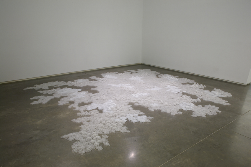Nebulous appears almost like a mist concentrated over the floor; its uneven shape suggests either a blown-up view of microscopic mold or a scaled-down model of the Milky Way. The work’s title hints at the uncertain perceptual experience that is created with nothing but “invisible” and “magic” Scotch tape. Donovan loops thousands of frosted strips into an irregular airy weave, saying, “Like fog, it becomes so soft. It looks like it grew out of the floor.” The groundbreaking installation signals Donovan’s exploration of the fugitive effects of light-reactive materials on architectural spaces. It has been singled out by the artist as her favorite piece for its successful visual transformation of the ordinary into the sublime.