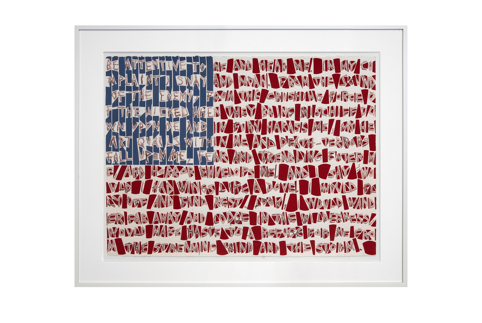 Be Attentive is from an ongoing series of paintings that take the form of the American flag. These works explore the capacity of ancient texts to address our present moment in the form of a recognizable symbol. The text in Be Attentive—which Davis painstakingly paints from above using a brush on a three-foot-long stick—conflates two different translations of Psalms 54 and 55, whose imagistic language the artist combines to create a vivid description of contemporary experience. To make the flag, Davis fills the negative space in between the painted letters with cut shapes of flat color, in red and blue sections. Through a unique combination of the written word with the image of the flag, Davis creates an experience in which the viewer is seeing and reading simultaneously, the text representing the form of a charged symbol with which they are confronted. According to the artist, Be Attentive was made in response to “the atrocities at the U.S. border, of children being taken from their families, the violence and ensuing grief, the collective trauma.” The intensity of the language drawn from sacred songs speaks to an emotional experience, in this case evoking the desire to escape the onslaught of those disagreeable actions sometimes done in the name of the flag.