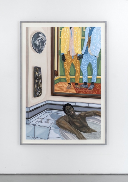 Each drawing from Ojih Odutola’s speculative narrative offers a vignette—most often of a well-dressed individual posed in an elegant domestic setting. Heir Apparent comes from the series’ final installment and features the nephew of Lord Jideofor Emeka and Lord Temitope Omodele, the presumed heir of their joint wealth. The portrait of the young man relaxing in a bath and surrounded by artwork, captures a private moment but speaks to self-possession and privilege. The framed work behind him, picturing two smartly dressed figures, is a direct quotation of an earlier work by Ojih Odutola portraying Lord Emeka and Lord Omodele on their honeymoon. This inclusion creates a kind of family portrait and signals self-fulfilling operations of wealth and inheritance, while also picturing Nigerian nobility through a gay union. The artist’s unfolding narrative, reiterated across five exhibitions since 2016, serves as an important conceptual frame of a black imaginary that transcends the transatlantic slave trade and colonialism. Heir Apparent exemplifies Ojih Odutola’s unique handling of surfaces, skin, and interiors, as well as her inventive narrative conceit of a reimagined Nigeria, whose portrayal challenges those often constructed by and seen in the West.