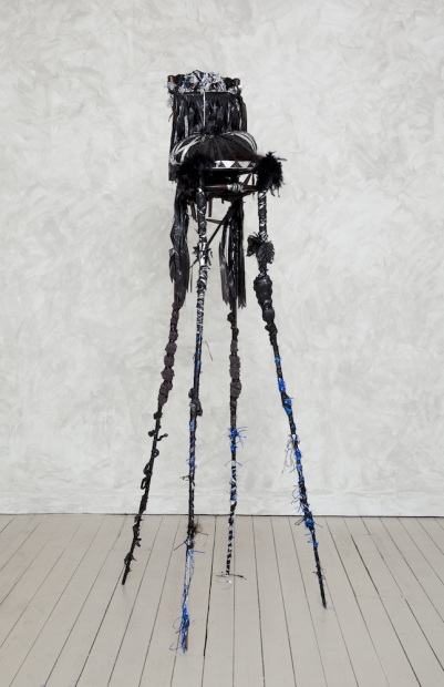 Wangechi Mutu, Blackthrone VIII, 2012. Wooden chair, plastic, hair, and tinsel. 100 7/8 x 26 7/8 x 39 7/8 inches (256.2 x 68.3 x 101.3 cm). Institute of Contemporary Art/Boston. Gift of Jerome and Ellen Stern. Courtesy of the artist. © Wangechi Mutu