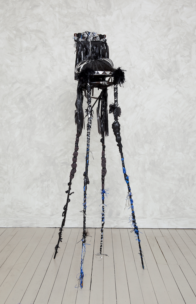 Wangechi Mutu, Blackthrone VIII, 2012. Wooden chair, plastic, hair, and tinsel. 100 7/8 x 26 7/8 x 39 7/8 inches (256.2 x 68.3 x 101.3 cm). Institute of Contemporary Art/Boston. Gift of Jerome and Ellen Stern. Courtesy of the artist. © Wangechi Mutu