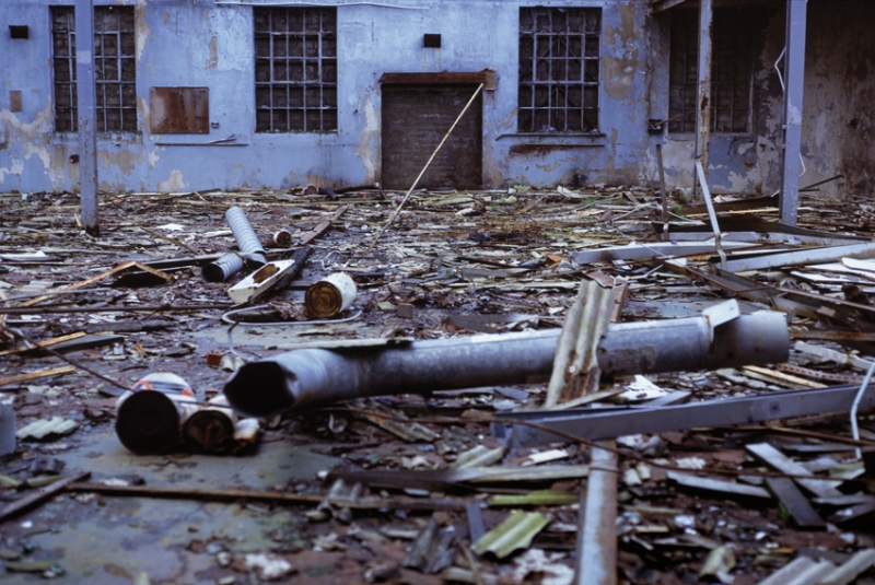 Factory III depicts an industrial yard filled with debris—segments of twisted metal pipes and broken fragments of wood—with the front of a dilapidated factory in the background. Cropped so only the yard, front windows, and roll top door of the factory are visible, the landscape gives off an eerie feeling that some sort of violence or devastation has taken place. As with many of Doherty’s works, Factory III stands as an archetypal scene of terrorism and political violence. The work activates universal emotions by playing off of the paranoia, anger, and desperation that rises to the surface when one encounters the detritus and broken windows of abandoned buildings. Yet the ambiguity of the photograph leaves the work open for multiple interpretations.