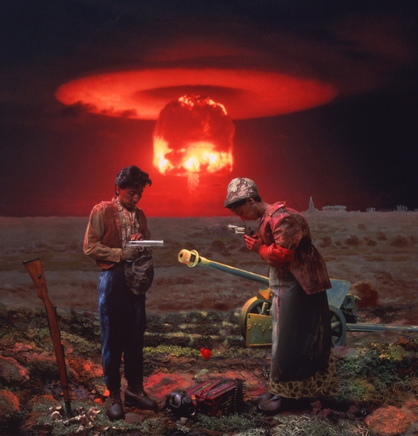 Yasumasa Morimura (Born 1951 in Osaka, Japan) uses imaging and photographic technology to investigate the genre of history painting in contemporary art. By also inserting himself into all of his images, Morimura creates an extended meditation on the complicated nature of narrative, portraiture, and mythology, showing how the contemporary individual is always rooted in historical precedent. Brothers (A Late Autumn Prayer) is inspired by French artist Jean-François Millet’s The Angelus (1857–59), in which two laboring peasants pray with bowed heads in a field. In lieu of the setting sun in Millet’s painting, Morimura has placed within his photograph the iconic image of a mushroom cloud, the atmospheric impact of a post-nuclear explosion. Other changes Morimura has made to Millet’s tableaux include farm tools exchanged for handguns and rifles, and himself posing as a peasant warrior rather than a tenant laborer. A powerfully visual comment on the devastation of war and nuclear disaster on the relationships between peoples and with the natural environment, Morimura’s photograph questions idyllic representations of history in the wake of historical violence.