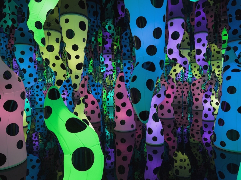 An icon of contemporary art, Yayoi Kusama (Born 1929 in Matsumoto, Japan) has interwoven ideas of pop art, minimalism, and psychedelia throughout her work in paintings, performances, room-size presentations, outdoor sculptural installations, literary works, films, design, and architectural interventions. Kusama came to New York City from Japan in 1957, joined the downtown avant-garde art community, and developed a style that embraced repetitive mark-making and organic patterns and forms on canvas, ultimately expanding to environmental creations after 1962. Her first mirrored environment, entitled Infinity Mirror Room—Phalli’s Field (1965), signaled a commitment to materially and socially immersive work as her traditional studio practice slowed in favor of protest events, performances, and happenings. Uniquely, her art-making broadens and evolves in tandem with the cultural, political, and visual revolutions of the psychedelic sixties. She returned to Japan in 1973 and for the next 25 years focused on writing and publishing poems and novels. In 2000, Kusama constructed Fireflies on the Water, her first darkened infinity room, and in 2013 she premiered LOVE IS CALLING in Japan.
