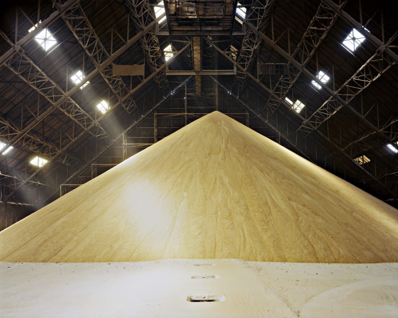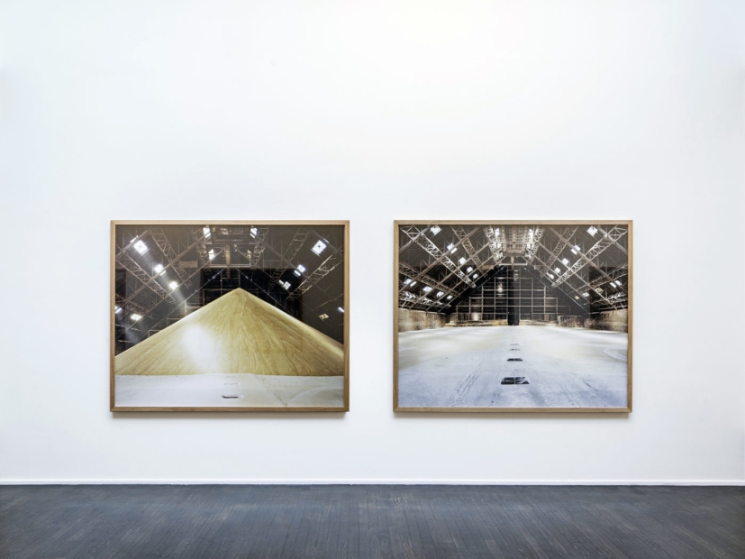 Zineb Sedira (Born 1963 in Paris) is a London-based, Franco-Algerian artist who explores universal themes of identity, mobility, memory, and humans’ relation to geography. Informed by her personal experience and background, Sedira uses photography, video, and installation to evoke questions about collective and individual memories and to shed light on past and present struggles of liberation and postcolonial movements. Interested in the sugar trade, its geographies, and the larger economic and political landscape behind this commodity, Sedira produced a series of photographs titled Sugar Routes tracing the global journey of sugar from locations throughout the world to the sugar silos of Saint Louis Sucre in France. From this series, Sugar Silo I & II is a diptych showing, on the left, an enormous mountain of cane sugar in a warehouse, and on the right, that same warehouse empty of sugar. The two photographs chart the collection and movement of sugar as a global commodity today. Algeria, a former French colony, is the largest sugar refiner in North Africa and its production has deep ties to French corporations. Drawing on the silenced past of Algeria, Sedira’s work visualizes the ongoing extraction of resources from the Global South for consumption by countries and economies of the North. This documentation of the global sugar trade in Sugar Silo I & II offers a poetic meditation on presence and absence as these are rooted in history and shape larger issues of migration, identity, and geography.