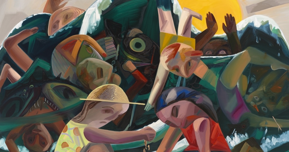Schutz’s paintings often show hypothetical or impossible physical feats and explore the uncanny through wit and the expressive use of color. Her physically imposing canvases—one nearly 18 feet—are worlds onto themselves. Building the Boat While Sailing (2012) displays a mass of people, working, sailing, and lounging, all at once. Shaking out the Bed (2015) portrays a couple in bed seen from a birds-eye vantage point, a common gesture transformed by the artist into a tornado of energy that includes pizza slices, body parts, cups, and dirty laundry. In Big Wave (2016) two figures in the foreground play in the sand, seemingly oblivious to the ferocious incoming tidal wave that is swallowing up fish, a tangle of bodies, and assorted objects.
