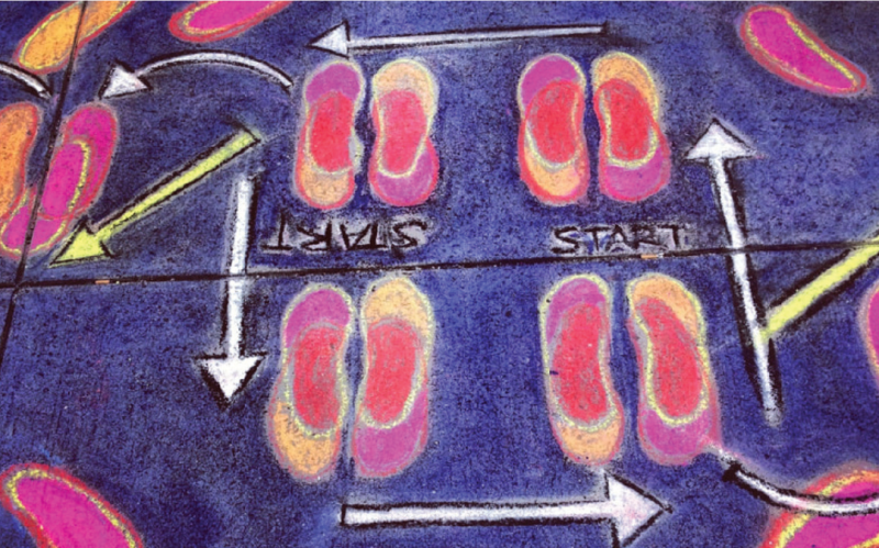 3. Chalk: Using chalk, draw a life-size copy of your map on the sidewalk. Trace around your shoes to make footsteps (your new stencil!). Make it big and bold for everyone to see! Now you have your Dance Spot!