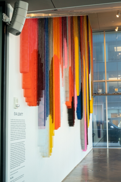 “LeWitt has a distinctive ability to make exuberant artworks out of everyday materials, often large wall-based sculptures of hanging geometric forms and waves of color. For Untitled (Mesh Circles), she combines lengths of fabric to great effect: an artwork that playfully responds to the museum’s unique architecture to truly enliven the space,” said De Blois.