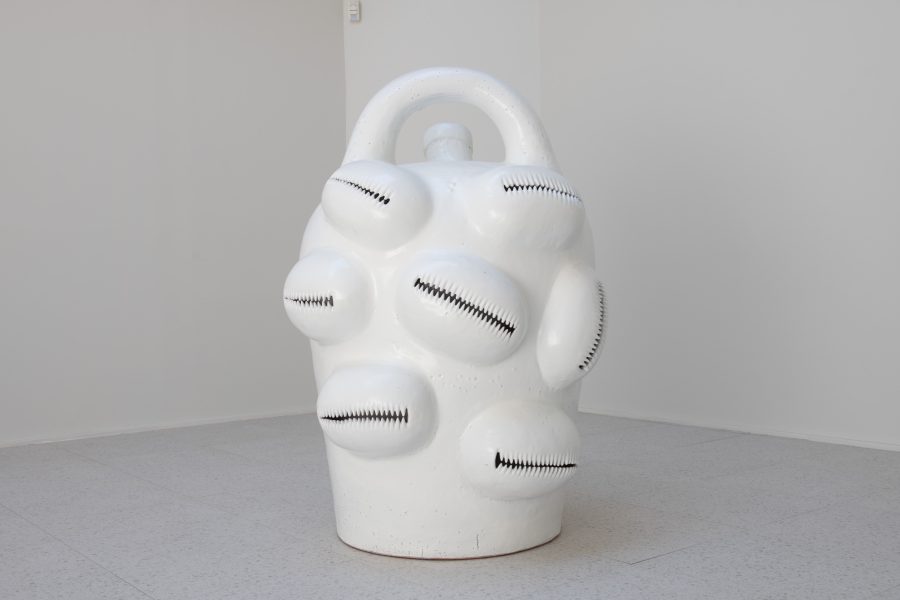 The exhibition opens with the impressively scaled trophallaxis (2008/2017), a suspended sculpture composed of clusters of black terracotta and porcelain forms that resemble fruit or breasts, from which a network of fully extended car antennas protrudes. The title adopts a scientific term describing the transfer of nourishment from insects’ bodies to the collective’s larvae, drawing associations of the femme body with fertility, nourishment, and labor—themes developed throughout the exhibition. A subsequent gallery features a selection of Leigh’s table-top ceramic busts with their distinctive eyeless faces.