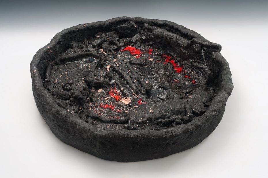 Toda esta información me dio una perspectiva diferente con la que mirar esta pieza y poder así conectar con ella. Basin Theology/La Brea 2 me hace pensar en una cápsula del tiempo en forma de pozo de alquitrán por su color predominantemente negro y textura ruda. Me imagino a mí mismo como paleontólogo, investigando el pozo y descubriendo los trozos de cerámica de sus descartes. Siento que estas piezas transmiten una historia sobre el proceso de crear arte. Ya no son restos inútiles, sino que permanecen atemporales como los fósiles y tienen un nuevo significado y propósito en la vasija. Al mismo tiempo, estos colores brillantes rojos y naranjas me dan la sensación de un lugar aún activo esperando para atraparte.