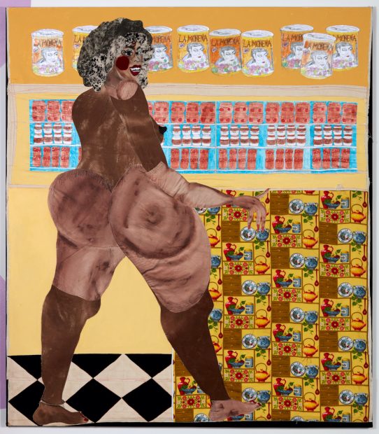 Ol’ Bay is from Tschabalala Self’s 2017 project, Bodega Run, encompassing the people, products, and everyday activities that make up the ubiquitous urban corner store. Each figure is set in these hallmarks of colored metropolitan life in New York, sites for social and political interpretation. Often operated by people of color to serve their communities, bodegas are microcosms of multicultural exchange. They are celebrated for camaraderie, late-night service, and unwavering commitment to the neighborhoods’ necessities. The avatars in Self’s series are based on characters you may pass in these places or encounter in the world. In Ol’ Bay, we are faced with familiar items and a larger-than-life personality.