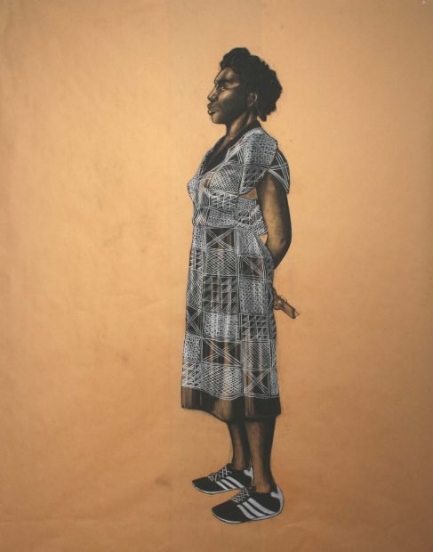There is a synergy about the painting on butcher paper that joins identity and process. Robert Pruitt is a stylistic polymath producing art in a variety of mediums and paintings. This painting represents both personal and cultural concerns. Looking closely is rewarded when you notice the box cutter partially hidden behind the women’s back, as if to cry out, “I’ve had it.” Box cutters have a fraught history in America. Despite the diversity of the African American population, there is an undercurrent of collective oppression. Witness an artist who once worked briefly designing craft projects for Martha Stewart flexing his visual muscles to remind viewers of the trouble he’s seen. The visual tension Pruitt portrays is palpable. Note the butcher-paper hue and that of the subject’s skin. The lighting contrasts support the mystery. And at the same time, the brown and black hues dance as comfortable partners. The figure is in profile in a patterned dress. But the facial expression is both confident and quizzical. Without background noise, the figure strengthens and presages a violence that just might be out there. Roughly the size of life, the lone figure warily presents. And I am reminded that after all, we all put our pants on one leg at a time.