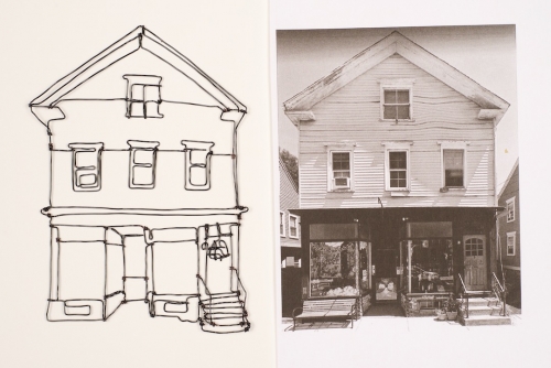 Side-by-side images of a line drawing of a house made from wire, and a sepia photograph of the same house