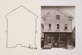 Side-by-side images of a line drawing of a house made from wire, and a sepia photograph of the same house