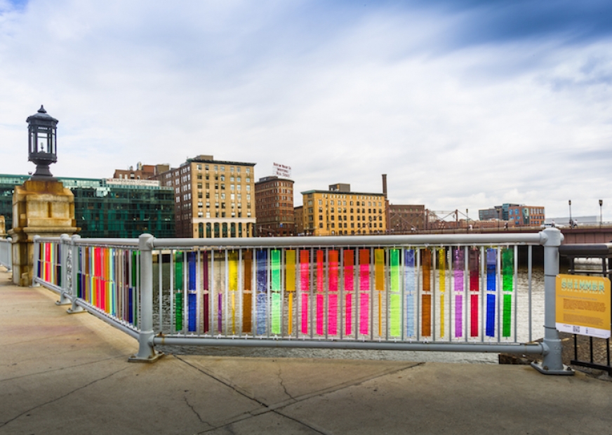 A jaunt across the Fort Point Channel bridges (on Summer Street and Congress Street) gives a glorious view of the Boston Harbor, the city’s skyline, and Claudia Ravaschiere and Michael Moss’s fluorescent and jewel toned plexiglass work Shimmer activates the Congress Street Bridge spanning Fort Point Channel and changes the public perception of a familiar urban environment. The work was comissioned by FPAC.