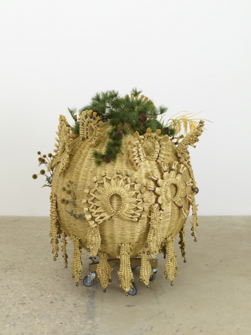 Haegue Yang’s The Intermediate—Inceptive Sphere (2016), which recently entered our collection, is both visually and conceptually compelling and a work one must experience firsthand. You have to crouch down to get a sense of the piece, its tactility, and the rich textures of the materials. Though near to the ground, the work has a palpable presence, as it poetically expounds upon the global, exploring the supposed, and fraught, East/West binary. Collecting and employing materials ranging from the banal, here plastic straw, to folk or ritualistic objects, such as a Korean bride’s headpiece and bells used in shamanistic rituals, Yang creates an “intermediate” space, somewhere between the real and artificial, civilization and nature, as well as the human and spirit worlds, and a space you’re invited to enter and engage with. —Jessica Hong, Curatorial Assistant