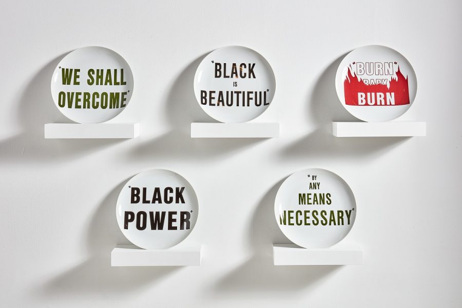 Kerry James Marshall’s five white, porcelain dinner plates from the multiple Untitled (1998) are printed with Civil Rights slogans such as “We Shall Overcome” and “Black is Beautiful.” Art historically the plates evoke Judy Chicago’s iconic feminist installation The Dinner Party (1974–79), but their political thrust makes me think of the meme that circulated around the 2012 election with African-American laborers next to a photo of the White House and the text, “We Built It.” Who are our objects of leisure and consumption made by and for? Were they made according to ethical labor practices, and if they could speak—as Marshall’s plates appear to—what stories would they tell? —Sam Adams, Curatorial Fellow