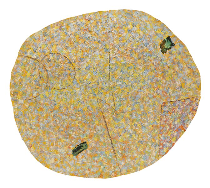 The third room includes a gathering of works that explore the use of vegetal ornamentation, from arabesques and French curves to other natural motifs. Frank Stella’s Brazilian Merganser, 5.5X (1980) from his Exotic Bird series—which marked the artist’s radical turn to dimension, color, and shape—is viewed with Nancy Graves’s Trace (1979–80), a cast-bronze polychromed and patinated sculpture that resembles a schematic tree. The flower and plant motifs that characterize paintings by Christopher Wool and Philip Taaffe echo in Polly Apfelbaum’s floor-bound painting Small Townsville (2001) and Laura Owens’s frieze-like Untitled (2015), creating a rich constellation of works that share a vocabulary of ornamentation.