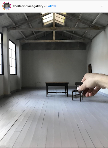 Local artist Eben Haines has used his time indoors to construct a light-filled, free-standing gallery – in his living room. The Shelter in Place Gallery, built at 1:12 scale, is currently showing a “massive” (22” x 14”) canvas by Wilhelm Neusser. If not for the intrusion of a seemingly enormous hand in certain images, one would have a hard time believing you won’t be able to visit this space, regardless of a quarantine. —Shane Silverstein, Performing and Media Arts Coordinator