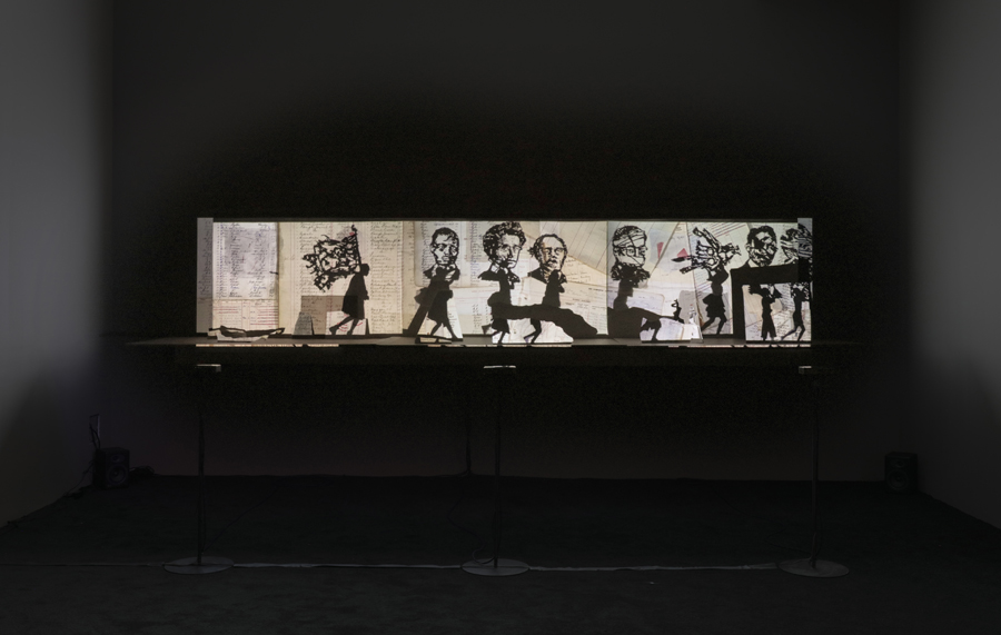 KABOOM! by the South African artist William Kentridge is a mixed-media three-channel work projected onto a scale model of the stage from the artist’s tour-de-force performance The Head & the Load. Employing his trademark multidisciplinary approach and his signature trope of the procession, Kentridge builds up dynamic layers of drawings, moving images, and texts projected over top of sculptural paper props to tell the story of the nearly two million African porters and carriers used by the British, French, and Germans during World War I. The ICA will present a standalone exhibition of this immersive work from July 22, 2020, through Jan. 3, 2021.