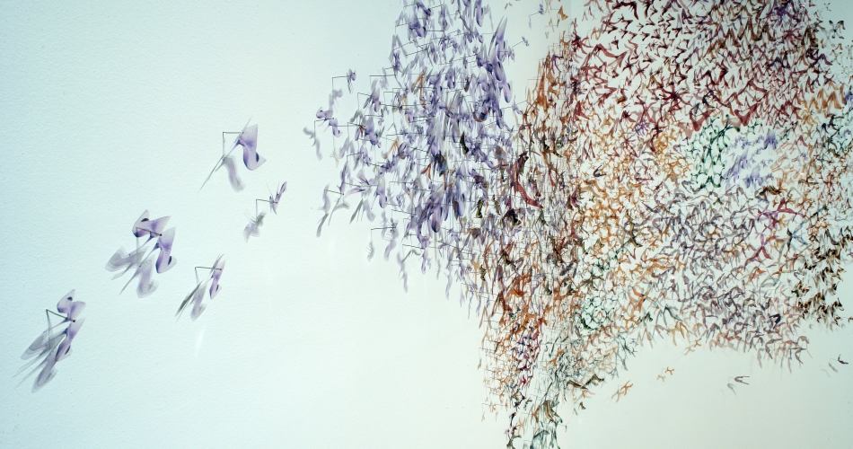 As a very young child, Ansell made a long journey from the Philippines to the United States. Her family’s personal experience traveling across vast oceans and continents encouraged her to further explore ideas of migration, flight, and movement in her later work as an artist. These ideas are important to Ansell, who believes that this early experience formed her view of herself, as well as how others regard her. Ansell’s intricate installations look like maps, topographical views, and swarms of butterflies, but upon closer inspection reveal surprising hidden imagery. The artist’s work has been exhibited at the International Center for Photography, NY; the Seattle Art Museum, WA; the San Diego Museum of Art, CA; and the Berkshire Museum, MA. Her most recent installation was exhibited at the 2016 Daegu Photo Biennale in South Korea. Read a Q+A with the artist
