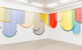 The vibrant sculptures of New York–based artist Eva LeWitt (b. 1985, Spoleto, Italy) transform industrially manufactured materials such as coated mesh, polyurethane foam, and latex into hand-fashioned environmental arrangements of hanging geometric forms and gradations of undulating color. For the ICA’s Sandra and Gerald Fineberg Art Wall, LeWitt will conceive of a monumental hanging wall sculpture made of colorful bands of coated mesh fabric whose shifting linear composition creates a number of interlocking circular forms. As the work’s crosshatched woven surfaces and fields of color overlap and respond to ambient conditions, an optical moiré effect is produced, creating a dynamic perceptual experience that vibrates throughout the museum’s interior. Organized by Jeffrey De Blois, Assistant Curator and Publications Manager.