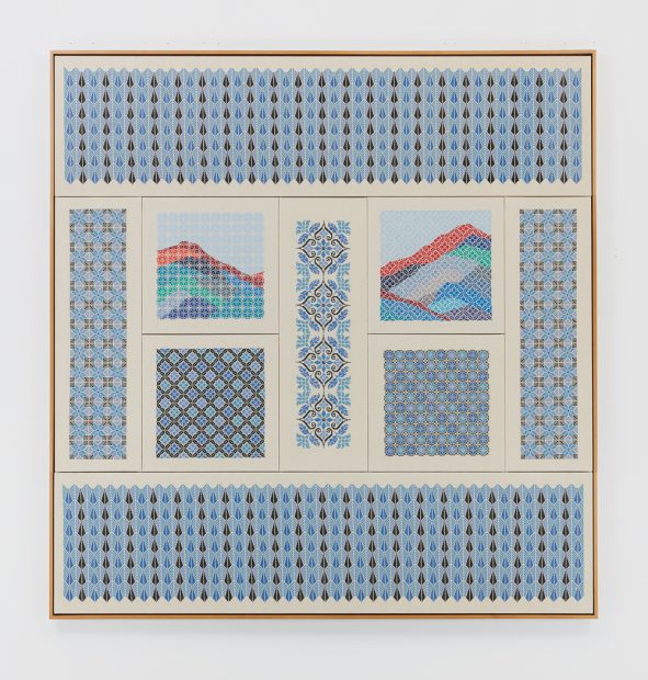 (Boston, MA—July 13, 2022) On August 11, the Institute of Contemporary Art/Boston (ICA) opens Jordan Nassar: Fantasy and Truth, a solo exhibition of the New York-based artist whose multifaceted practice draws on traditional Palestinian craft to investigate ideas of home, land, and memory. As a self-taught artist, Nassar (b. 1985 in New York) is mostly known for his use of Palestinian tatreez, a matrilineal tradition of cross-stitching. In collaboration with a Palestinian embroidery collective based in the West Bank, the artist composes his embroideries from numerous individually made panels that together weave breathtaking, layered panoramas suggestive of an expansive sky or a boundless horizon. Fantasy and Truth presents the artist’s largest embroidered panels to date, alongside recent work in wood and glass mixed media. Organized by Anni Pullagura, Curatorial Assistant, the exhibition is on view August 11, 2022 through January 29, 2023.