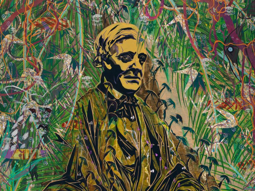 Nguyen’s new works are tied together by the line “what is a farm but a mute gospel?” from Nature, which intimates Emerson’s idea that God is reflected everywhere in nature. Dense layers of foliage combine plants and trees of the U.S. Northeast with the flora and fauna of tropical environments to create jungle-like landscapes where everything is interwoven. Emerson is one of the figures who recurs throughout the new works, along with Jesus, Demeter, and Ngô Đình Diệm.