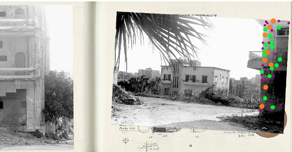 Let’s be honest, the weather helped (1998/2006) comprises images of notebook pages featuring black-and-white photographs that Raad himself took in Beirut during and after the civil war. These images of pockmarked buildings and bombed-out neighborhoods are overlaid with different-sized colored disks that map bullets and shrapnel, again collected by Raad after bombings and battles when he was a child in Beirut. The colors are linked to the national origins of the ammunitions and form a more expressive and poetic image, rather than one that is purely meant to document. The weather, referenced in the title of the work, is a recurring motif in The Atlas Group; the banal staple of small talk, it is neutral, unpredictable, and acts as an equalizer, circumscribing the direct address of violence.